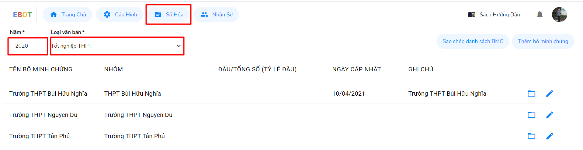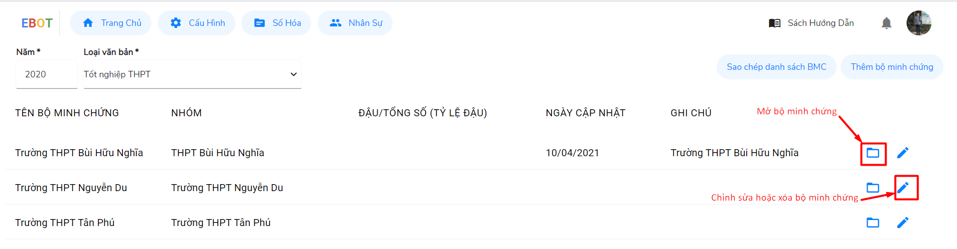 Bước 4: Để sửa thông tin của bộ minh chứng thì bấm vào biểu tượng cây bút sau tên trường đó