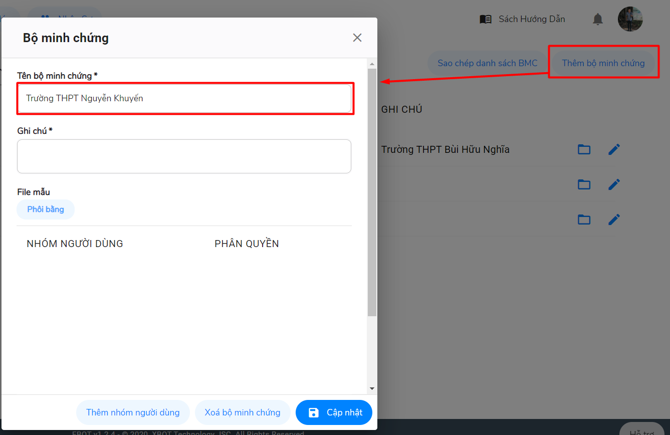 Bước 2: Nhập tên bộ minh chứng, nhập ghi chú (nếu có).