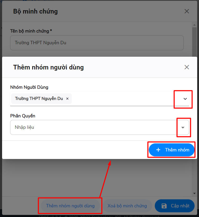 Bước 3: Chọn nhóm người dùng là tên trường tương ứng với minh chứng đang cần tạo( là nhóm đã tạo ở chức năng nhân sự).