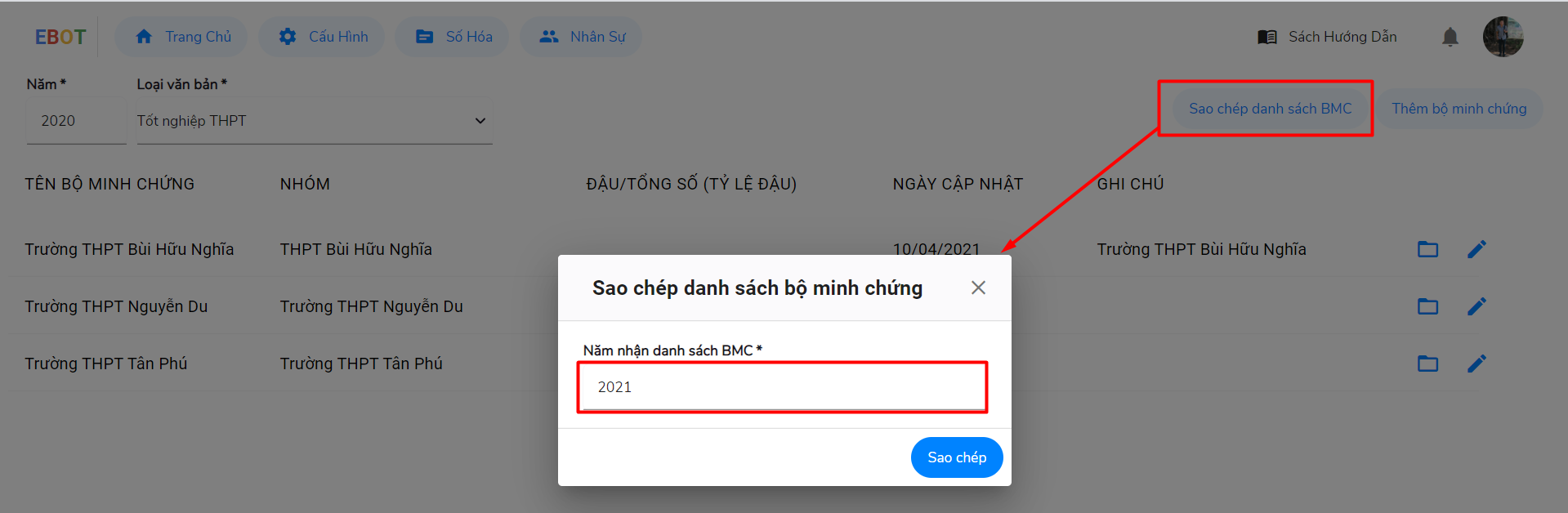 Dùng để sao chép danh sách bộ minh chứng đã tạo từ năm cũ sang năm mới để sử dụng tiếp, không cần phải tạo lại. Đầu tiên chọn vào năm có bộ minh chứng cần sao chép.