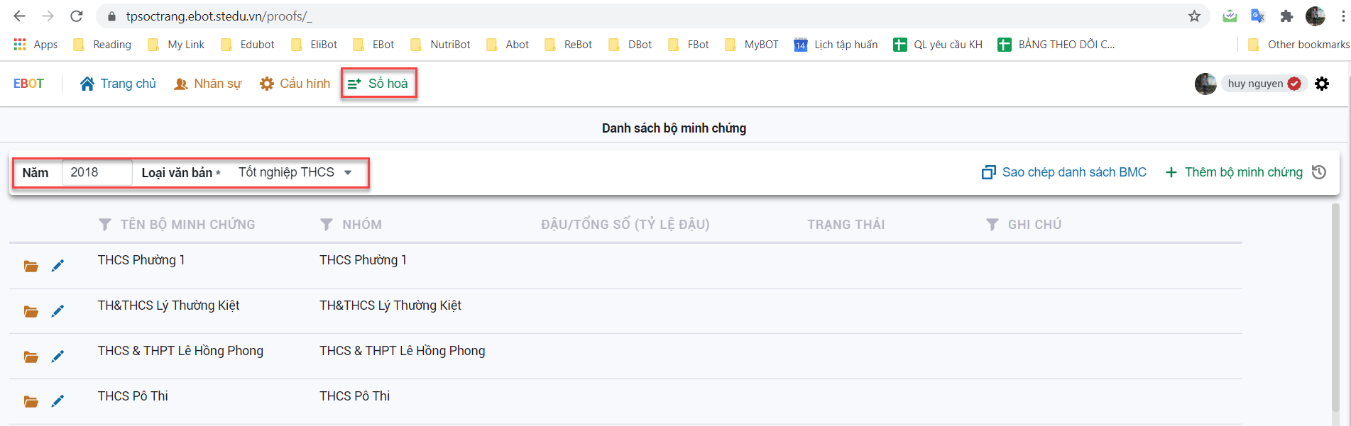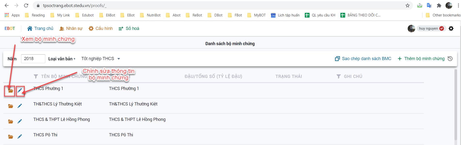 Bước 4: Để sửa thông tin của bộ minh chứng thì bấm vào biểu tượng cây bút trước tên trường đó