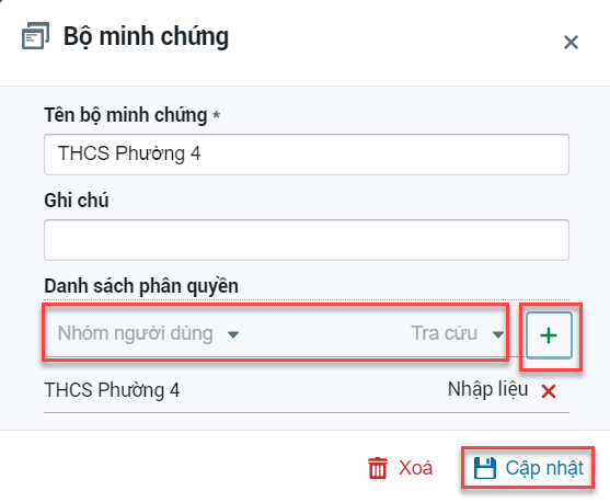Bước 4: Chọn chức năng là nhập liệu để cho phép đơn vị trường có thể thao tác với bộ minh chứng mới sau đó bấm dấu + màu xanh.