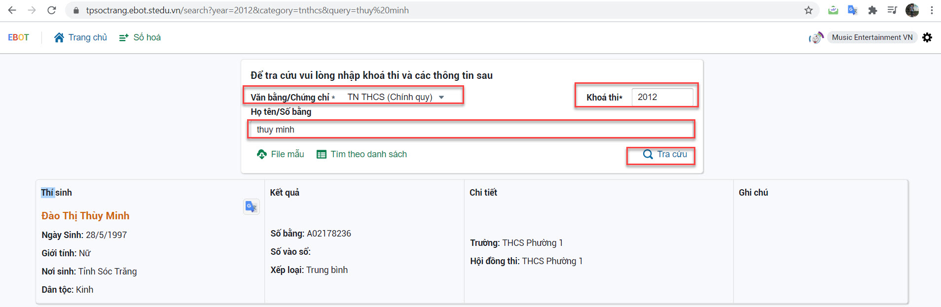 Bước 2: Điền thông tin để tìm kiếm : loại văn bằng/chứng chỉ , Khóa thi, họ tên/số bằng