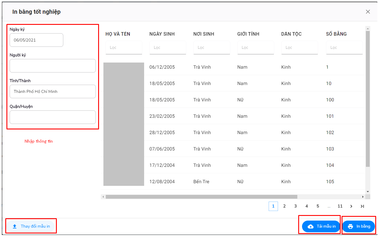 Lưu ý: Nếu danh sách học sinh tốt nghiệp chưa cập nhật Số bằng thì sẽ không hiển thị danh sách in bằng (file in bằng xuất về sẽ không có dữ liệu)